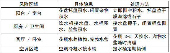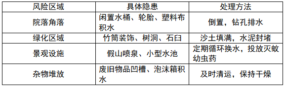 每周也应安排清洁日,检查屋顶排水孔、雨棚是否有积水;给水生植物换水,认真冲洗根部,清理蚊卵与幼虫附着。